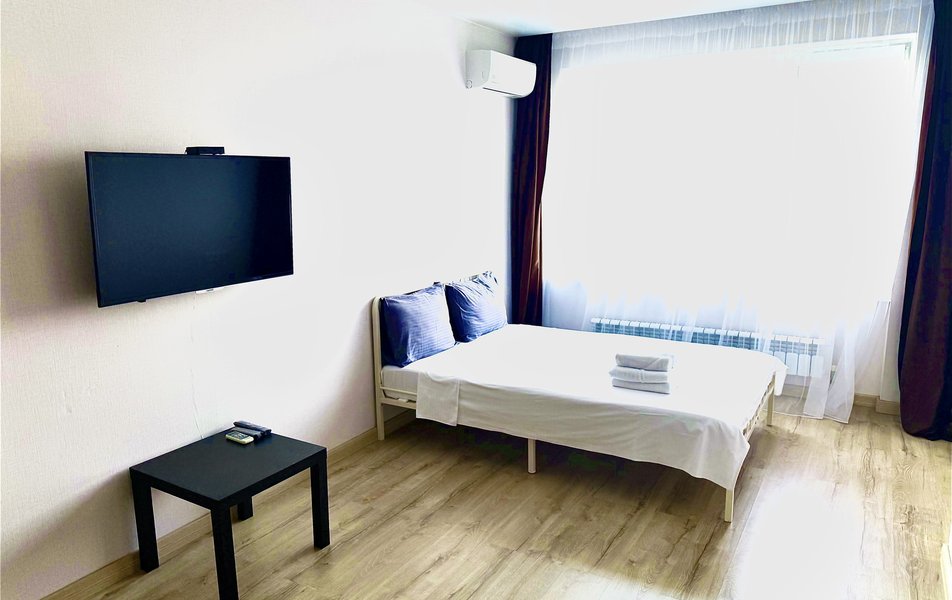 Внутри царит атмосфера современного урбанистического лофта: просторные светлые помещения с высокими потолками и панорамными окнами наполнены воздухом и светом. Интерьер выдержан в стиле индустриального шика с тёплыми акцентами, создавая одновременно динамичное и уютное настроение. Для отдыха предусмотрена уютная спальня с двуспальной кроватью, а в гостиной раскладной диван легко превращается в дополнительное спальное место для гостей.