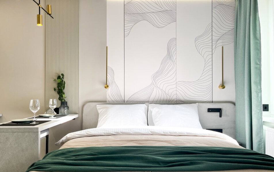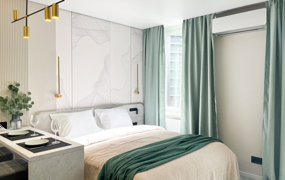Апартаменты рассчитаны на проживание 2 гостей. Интерьер выполнен в светлых оттенках с использованием яркого текстиля. Для сна установлена большая и удобная кровать. Есть телевизор, Wi-Fi. Санузел оснащен ванной, есть стиральная машина, предоставляются туалетные принадлежности и полотенца. Кухня полностью укомплектована для самостоятельной организации питания.
