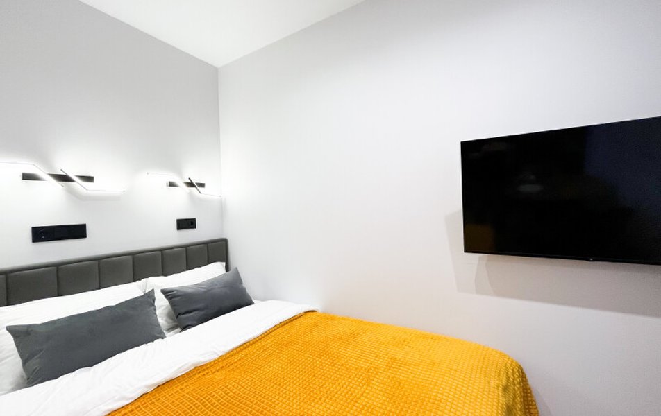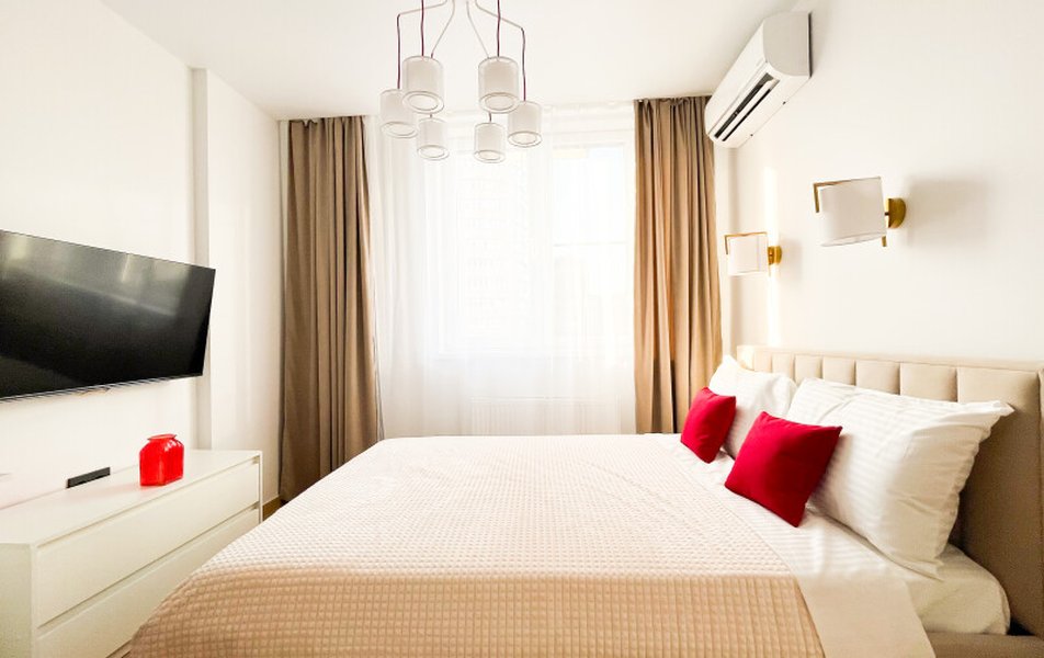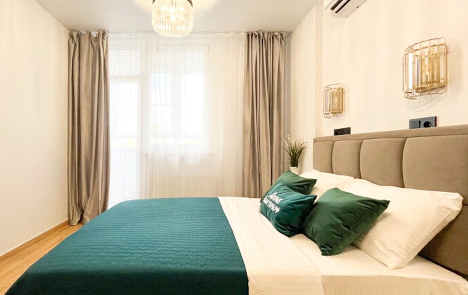 Интерьер апартаментов выполнен в светлых оттенках. Для сна установлена большая и удобная кровать, а также раскладной диван. Есть телевизор, Wi-Fi. Санузел оснащен стиральной машиной, предоставляются туалетные принадлежности и полотенца. Кухня полностью укомплектована для самостоятельной организации питания.