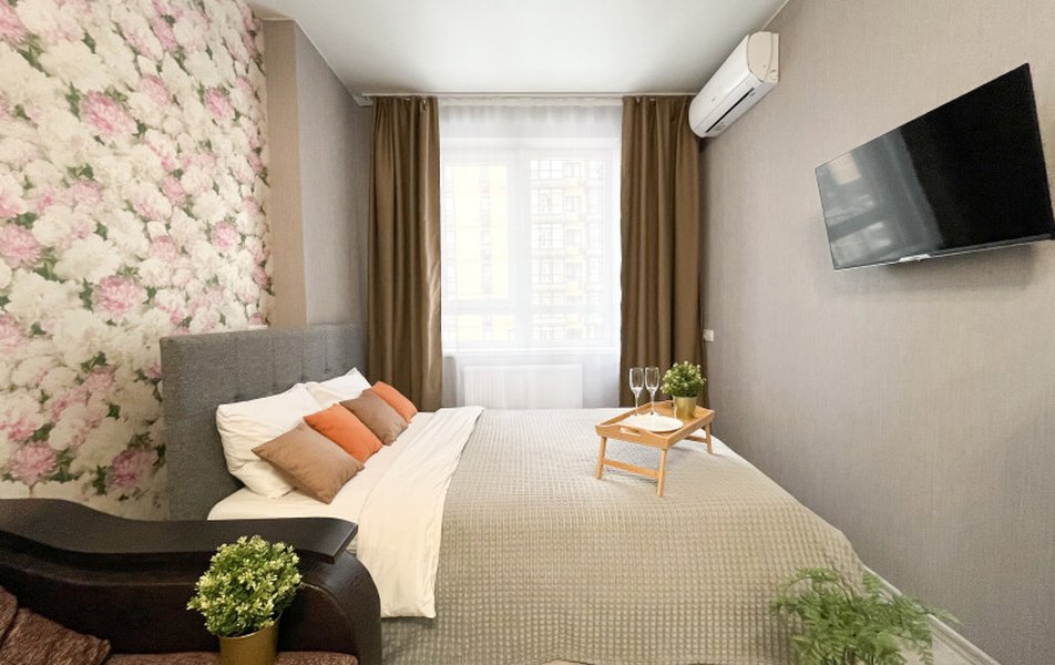 Апартаменты рассчитаны на проживание 4 гостей. Интерьер выполнен в светлых оттенках с использованием яркого текстиля. Для сна установлена большая и удобная кровать, раскладной диван. Есть телевизор, Wi-Fi, рабочая зона. Санузел оснащен современной сантехникой, установлена стиральная машина, предоставляются туалетные принадлежности и полотенца. На балконе установлена мебель для отдыха. Кухня полностью укомплектована для самостоятельной организации питания.