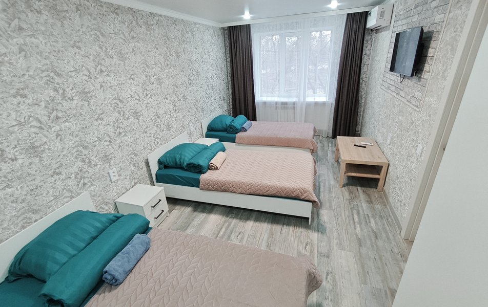 Просторное трёхкомнатное пространство с тремя изолированными комнатами рассчитано на комфортное размещение до восьми человек. Интерьер выполнен в современном дизайнерском стиле, всё в нём новое и продуманное до мелочей. В комнатах установлены восемь отдельных кроватей размером 80х200 см с ортопедическими матрасами, что гарантирует здоровый и полноценный сон. Два смарт-телевизора позволят с удовольствием провести вечер, а Wi-Fi поможет оставаться на связи. Сплит-система обеспечивает комфортную температуру в любое время года. Кухня полностью оборудована для приготовления еды: газовая панель, микроволновая печь, холодильник с морозильной камерой, чайник и полный набор посуды, столовых приборов и кухонной утвари. Для утреннего кофе предусмотрены чай, кофе и сахар. В ванной комнате — душ, стиральная машина-автомат, сушка для белья, фен, а также утюг с гладильной доской. Гостей ждут свежее постельное бельё и предметы личной гигиены. Чистота и свежесть здесь поддерживаются ежедневно профессиональными горничными.