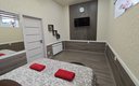 Интерьер дополнен светодиодной подсветкой и обилием зеркал. Для комфортного пребывания предусмотрен беспроводной интернет и телевизор, сплит-система, вместительный холодильник и микроволновая печь. На функциональной кухне найдется чайник, полный комплект посуды на двоих, а также бутилированная вода и набор чая с кофе. Ванная комната укомплектована свежими полотенцами, постельным бельем и средствами для душа.