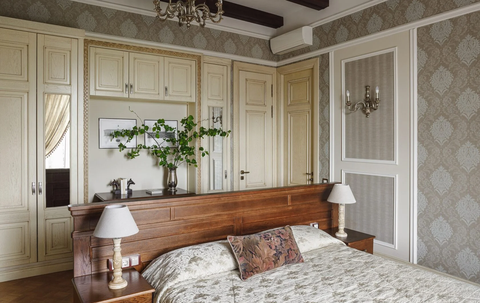 | Мебель | вешалка зеркало кровать двуспальная кровать полутороспальная прикроватные тумбочки стол стул шкаф |