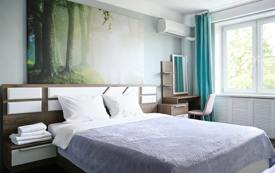 | Мебель | вешалка диван раскладной зеркало кровать двуспальная прикроватные тумбочки стол стулья шкаф |