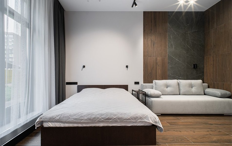 Свободная планировка превращена в уютное пространство для двоих или небольшой компании до четырёх человек. Здесь — всё для комфорта: двуспальная кровать, раскладной диван, кухня с техникой, современная сантехника и высокоскоростной Wi-Fi. Окна выходят во внутренний двор — тихо, спокойно, без городской суеты за стеной.