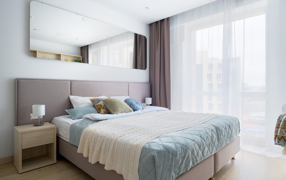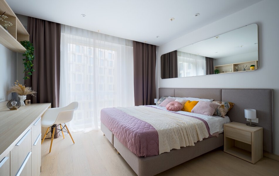 | Мебель | вешалка зеркало кровать двуспальная прикроватные тумбочки стол стулья шкаф |