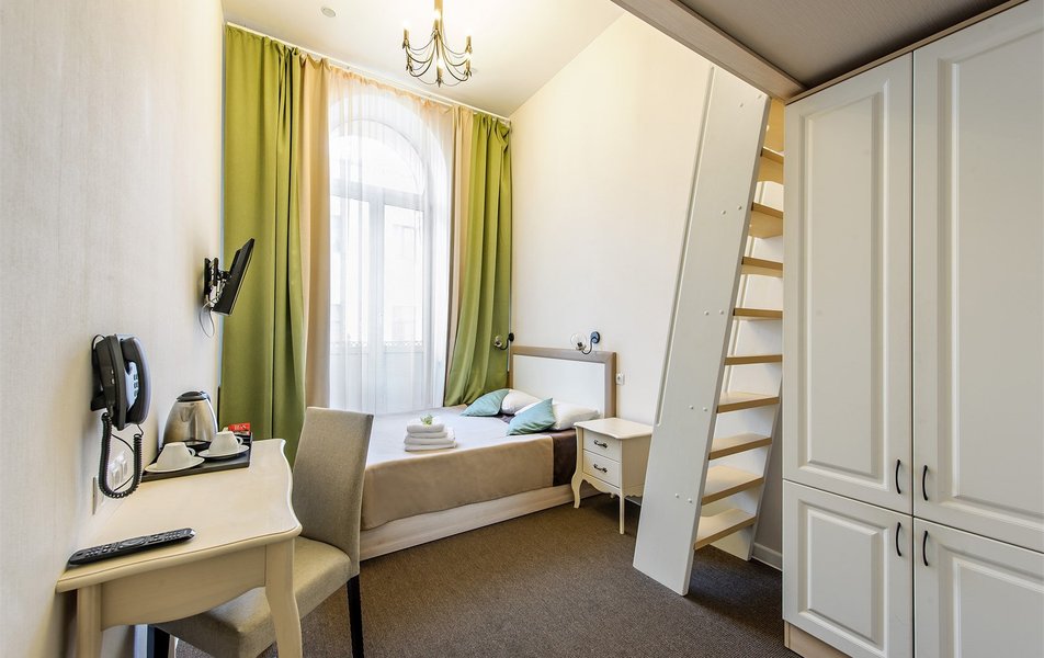 Отель разместился в шестиэтажном историческом здании с ризалитами. Гостей ожидают 15 комфортабельных номеров, оформленных в светлой пастельной гамме. В каждом номере есть кондиционер, телевизор, в ванной комнате — душевая кабина, фен и набор косметических принадлежностей.
