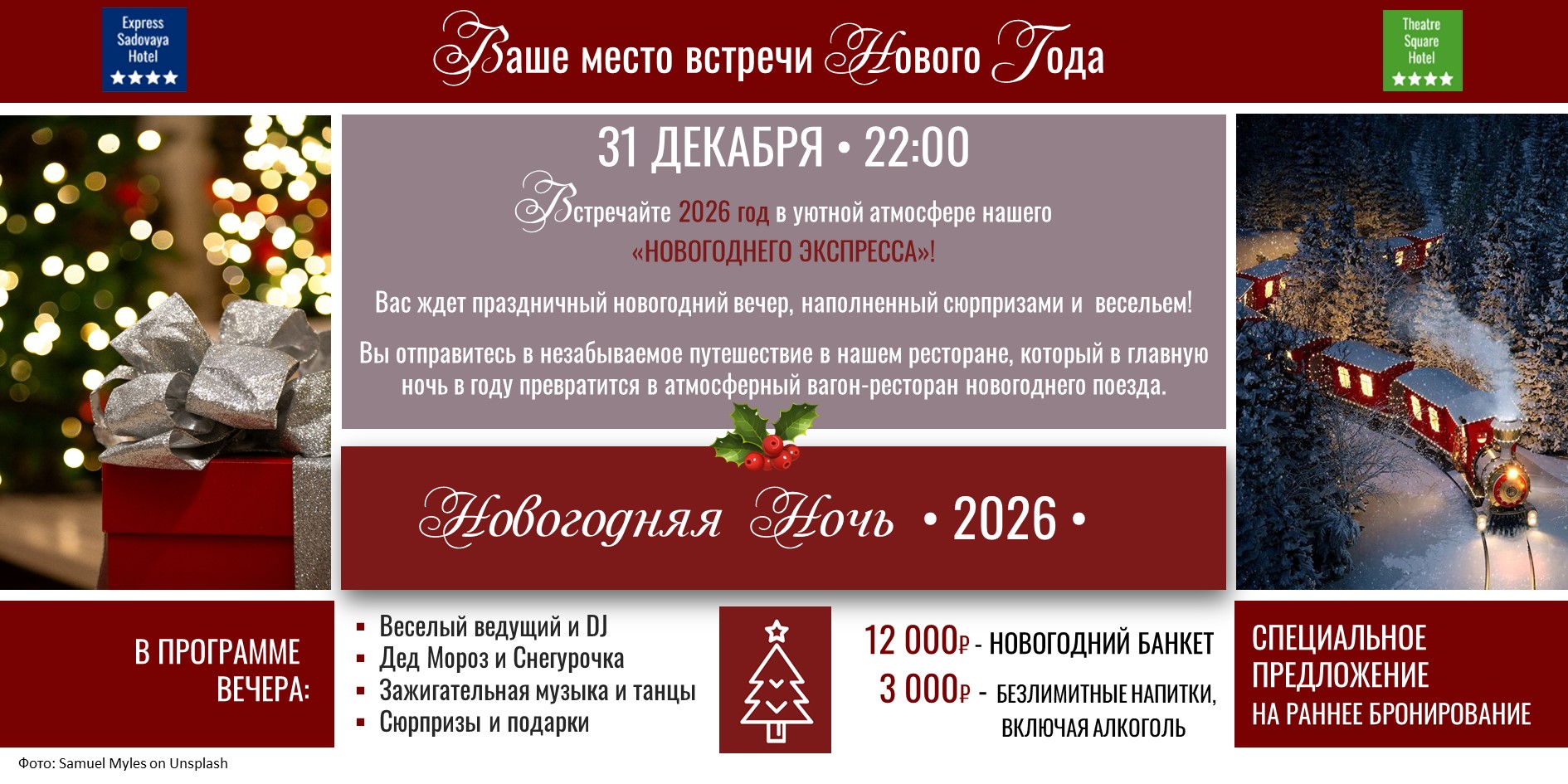 Приглашаем Вас провести Новогоднюю ночь 2026 в ресторане отеля ЭКСПРЕСС САДОВАЯ.