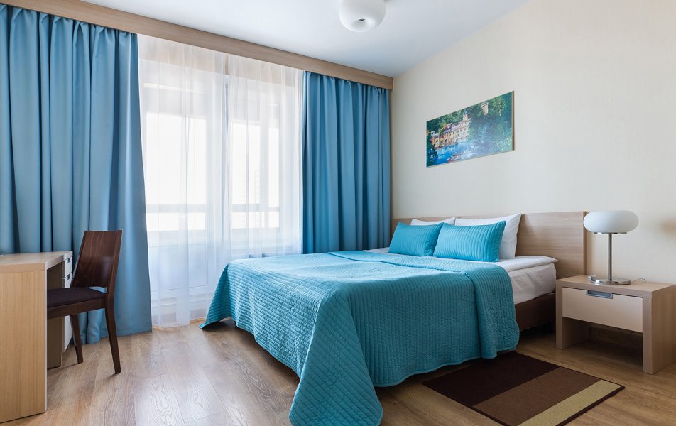Просторные апартаменты (38 кв. м) с двуспальной кроватью подойдут как для деловых поездок, так и для отдыха с семьей. Для Вашего удобства в номере установлено мягкое кресло, которое может служить дополнительным местом.