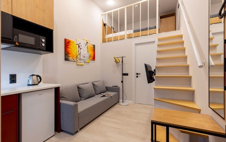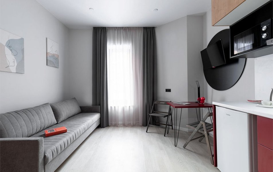 Пространства оформлены в скандинавском лаконичном стиле: белые и серые тона, дерево, тёплый рассеянный свет, стены с текстурой. В каждом номере — телевизор, чайная станция и полностью оборудованная мини-кухня с посудой. Ванная комната оснащена душем, феном, туалетными принадлежностями. Гостей ждут качественный текстиль, повышенная шумоизоляция и продуманная эргономика. Предусмотрены варианты с панорамным остеклением, французскими балконами и двухуровневые апартаменты с отдельным входом. На территории комплекса — системы видеонаблюдения и удалённого контроля доступа.