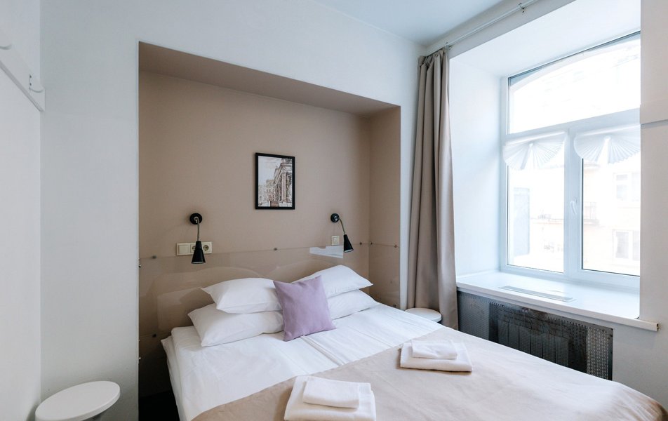 Поездом до ж/д вокзала Московский (г. Санкт-Петербург), далее на метро до станции «Владимирская», далее на метро до станции «Спасская», далее пройти 880 м до отеля.