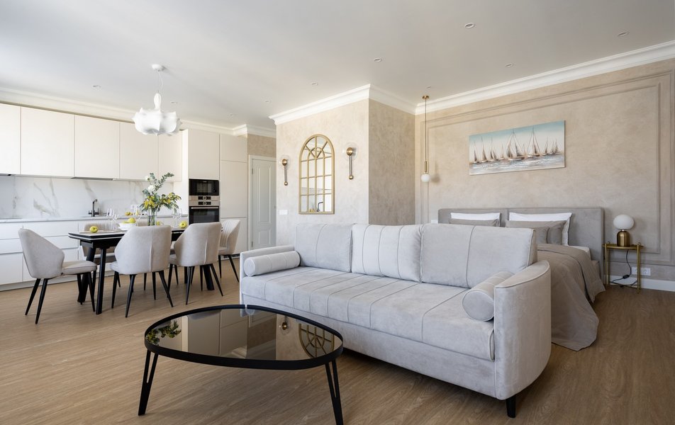 Просторные апартаменты с новым ремонтом предлагают комфортное проживание. В апартаментах имеются две удобные кровати и диван-кровать, что позволяет разместить до шести человек, телевизор, интернет Wi-Fi, полностью оборудованная кухонная зона со всей необходимой бытовой техникой, санузел с современной сантехникой и душевой, стиральная машина, гладильные принадлежности. В апартаментах используется только современное оборудование, что создает ощущение настоящего уюта. Кроме того, окна выходят на улицу, что позволит наслаждаться прекрасными видами и создаст приятную атмосферу для работы и отдыха.