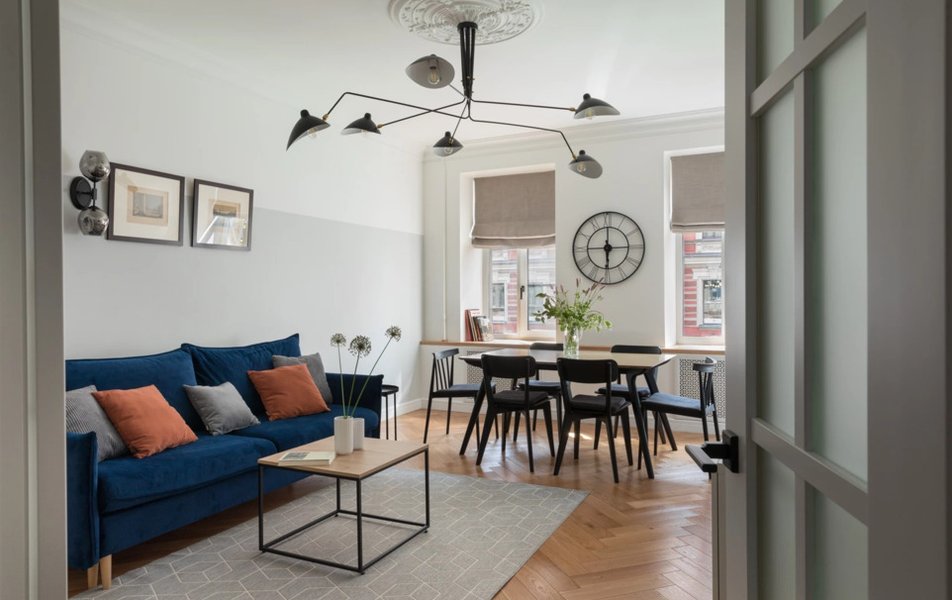 В апартаментах гостей встречает атмосфера сдержанной элегантности, где продуманный дизайн создает ощущение уютного убежища в самом сердце оживленного города. Пространство, состоящее из двух спален, ванной комнаты и объединенной кухни-гостиной, предлагает все необходимое для комфортного отдыха. В гостиной мягкий диван-кровать и экран Smart TV приглашают к расслаблению, а на полностью оборудованной кухне найдется вся посуда для приготовления любимых блюд.