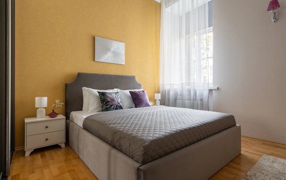 Просторное пространство площадью 77 квадратных метров рассчитано на размещение до шести гостей. Интерьер с авторским дизайном погружает в атмосферу английского городка: две большие спальни с кроватями Queen-size, гостиная с диваном-кроватью, множество мест для хранения вещей. Полностью оборудованная кухня радует наличием духового шкафа, кофемашины, посудомоечной машины, микроволновой печи, холодильника с морозильной камерой, чайника, тостера и полного набора посуды и кухонной утвари. В ванной комнате — ванна, душевая кабина, стиральная машина, сушилка для белья, фен, утюг с гладильной доской, тапочки и банные принадлежности. В апартаментах есть телевизор и бесплатный Wi-Fi. Гостей ждут свежее бельё, полотенца и базовая косметика.
