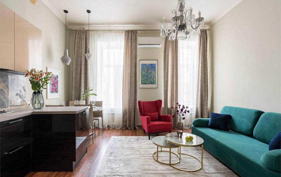 Пространство апартаментов в палитре мягких тонов создает атмосферу умиротворения. Просторная гостиная с уютной обеденной зоной и полностью оборудованной кухней плавно перетекает в две отдельные спальни, предлагая идеальный баланс между общением и личным пространством, что особенно ценно для длительного проживания. Окна, выходящие одновременно на оживленную улицу и тихий дворик, позволяют гостю самому выбирать настроение — наблюдать за ритмом города или наслаждаться камерной тишиной.