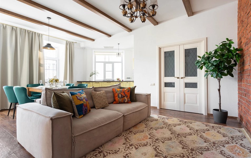 Внутри гостей встречает светлое пространство, оформленное с яркими жизнерадостными акцентами. В каждой из двух спален установлены кондиционеры и затемняющие плотные шторы, которые особенно ценятся в период белых ночей. Кровати можно легко раздвинуть, создав удобные односпальные места. Просторная гостиная с большим раздвижным диваном становится идеальным местом для совместного отдыха. Кухня, залитая светом из большого окна, оснащена всей необходимой техникой: от посудомоечной и стиральной машин до кофемашины и тостера, позволяя легко готовить домашние блюда.
