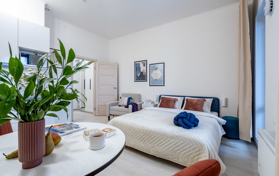 Апартаменты находятся в 12-этажном жилом доме с лифтом, рассчитаны на проживание от 3 до 6 гостей. В комнатах выполнен современный ремонт с яркими цветовыми акцентами. Апартаменты полностью мебелированы, имеются удобные кровати с ортопедическими матрасами, гладильные принадлежности, стиральные машины, беспроводной интернет, телевизоры с плоским экраном. Санузлы оснащены душевыми, имеются полотенца и гигиенические принадлежности. Кухня оборудована бытовой техникой и посудой для самостоятельного приготовления пищи.