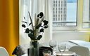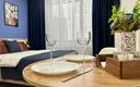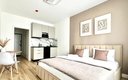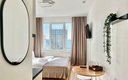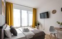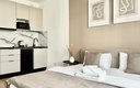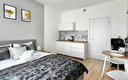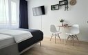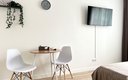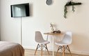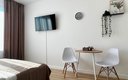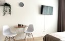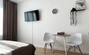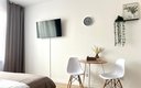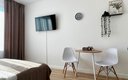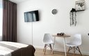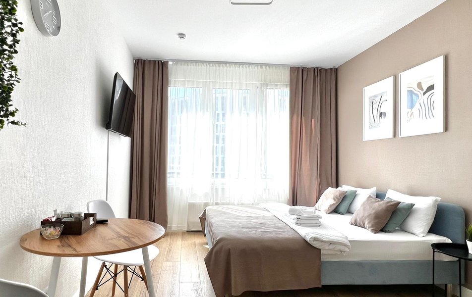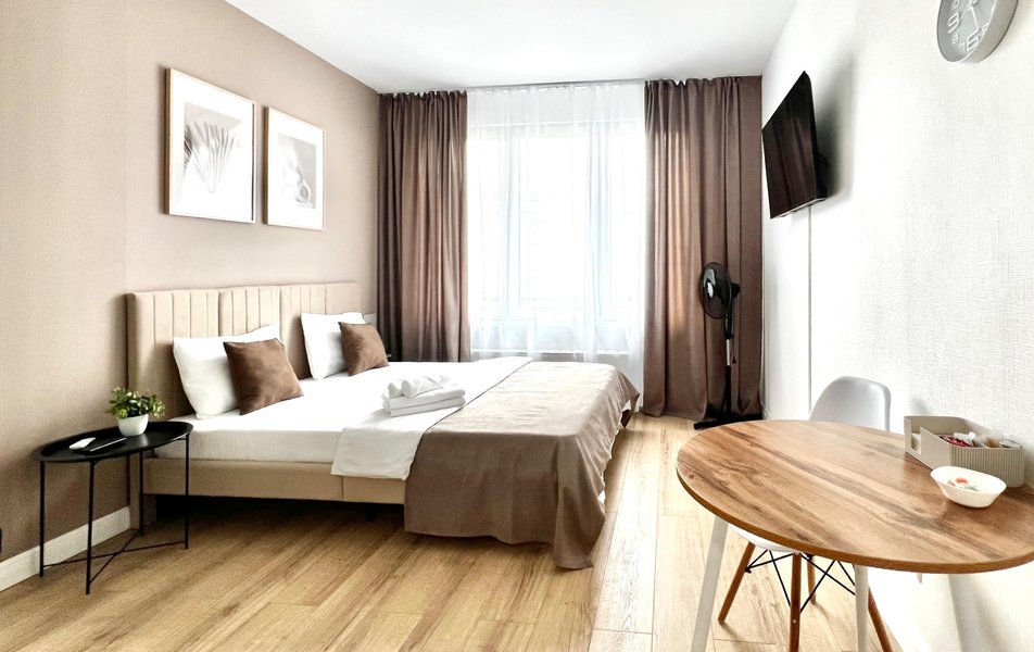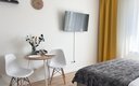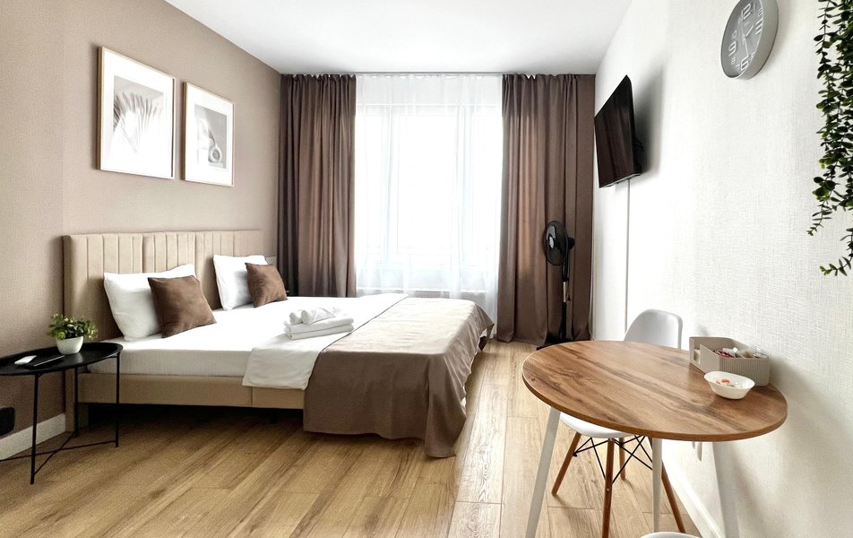 Гостям предлагаются уютные Студии рассчитанные на комфортное размещение двух человек. В каждом номере — удобная двуспальная кровать, обеденный стол со стульями, вместительный шкаф и зеркало. В некоторых вариантах дополнительно предусмотрены прикроватные тумбочки.
