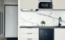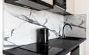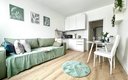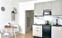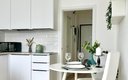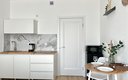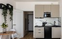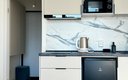 Кухня полностью оборудована для самостоятельного приготовления пищи: электрическая плита, холодильник, микроволновая печь, электрочайник и полный набор посуды. В некоторых студиях дополнительно установлена посудомоечная машина. В ванной комнате с душем гостей ждут стиральная машина и туалетные принадлежности. Для комфортного пребывания предусмотрены телевизор, беспроводной Wi-Fi, а также утюг.