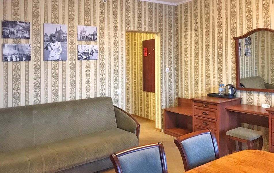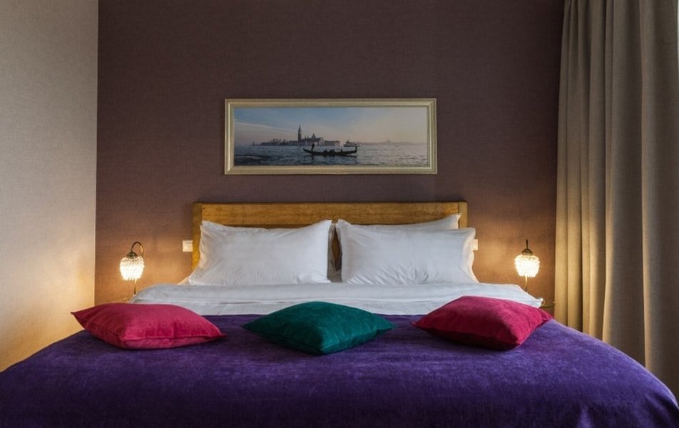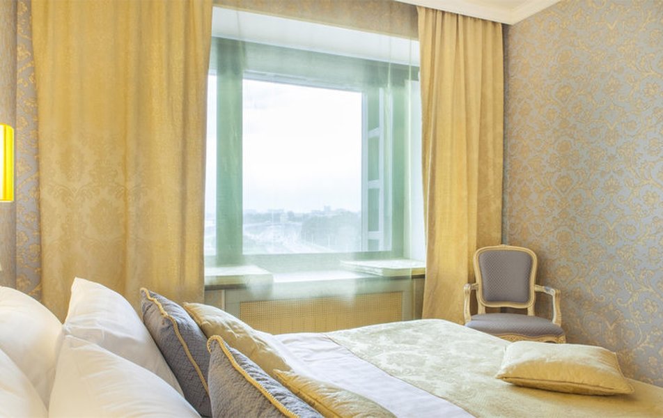 There are 2 rooms. Living room has a sofa, two armchairs, desk and coffeetable. Bedroom has got a double bed. From the hotel’s windows overlooking the Neva embankment.