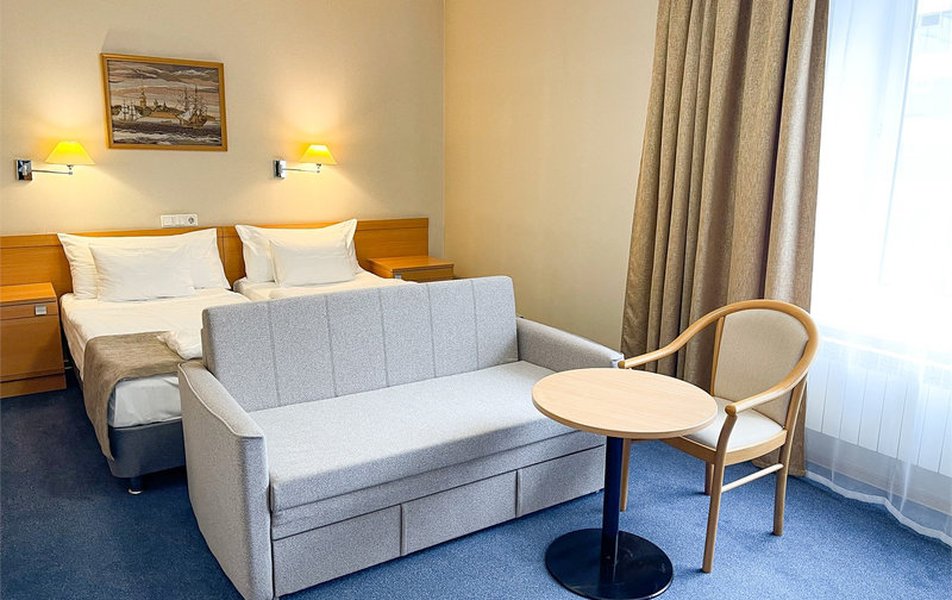 The room has one double or two single beds, desk and coffee-table with two armchairs.