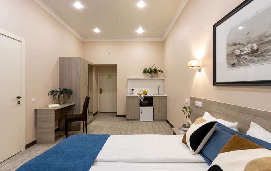Отель занимает часть малоэтажного здания и оборудован отдельным входом с улицы. Номерной фонд включает апартаменты нескольких категорий: стандартные, улучшенные и семейные. Каждый вариант размещения стильно и современно оформлен, располагает удобными спальными местами, функциональной мини-кухней, ванной комнатой с душевой. Разрешено заселение с питомцем.