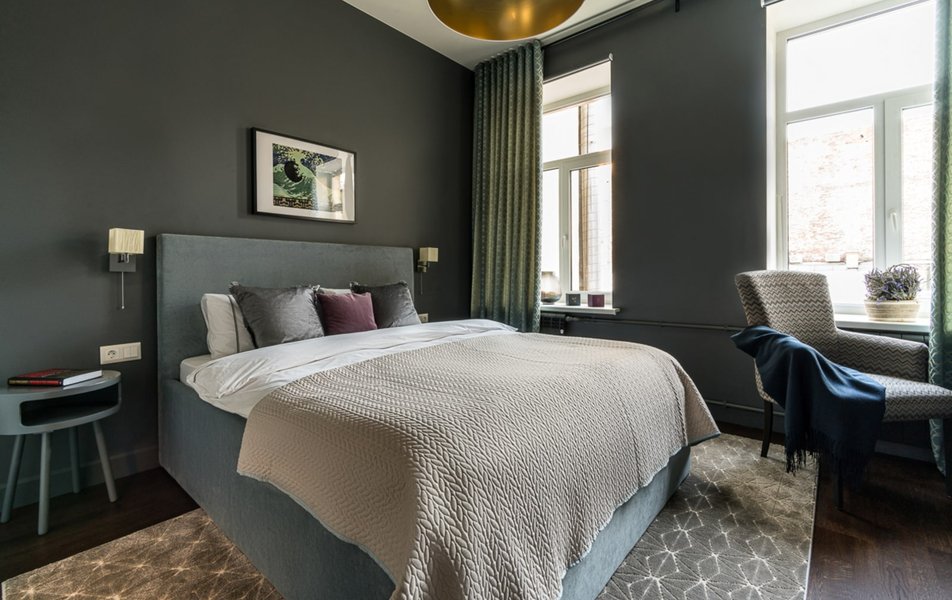 В апартаментах две уютные спальни с бархатной мебелью и удобными шкафами. Окна со шторами blackout выходят во двор — спокойный отдых обеспечен. Эргономичная гостиная с ярким диваном совмещена с кухней, где есть все необходимое: плита, микроволновая печь, холодильник, кофемашина Nespresso. В любое время возможна доставка еды из ресторанов Ginza Project.