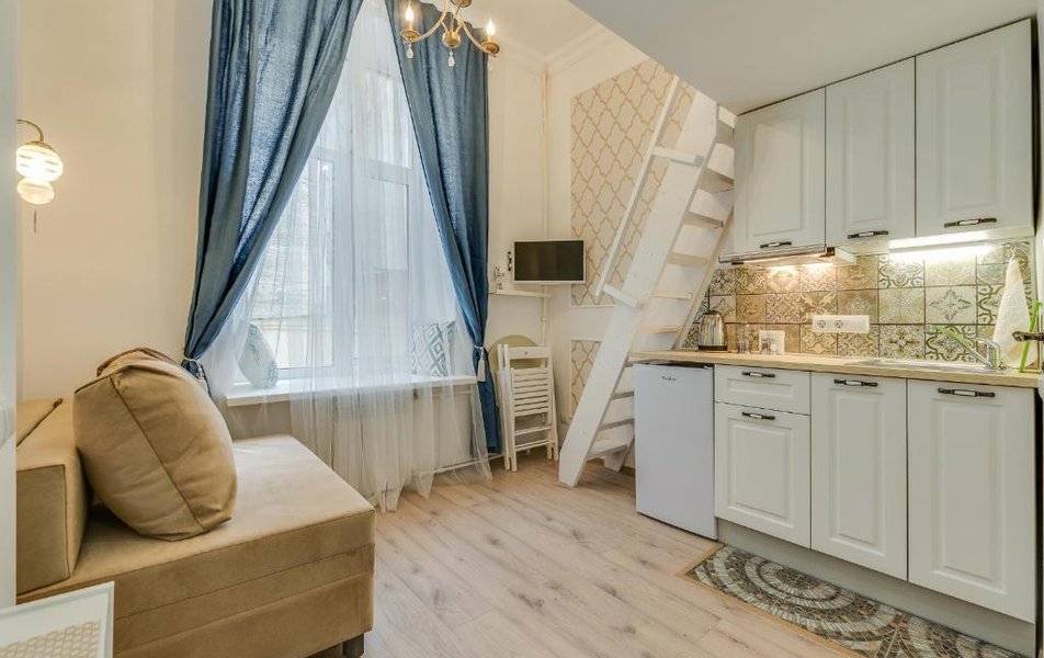 Апартаменты разместились в историческом трехэтажном здании, расположенном на набережной реки Фонтанка. В XIX веке в этом особняке был салон Олениных, где устраивались танцевальные вечера. На балы приходило много известных людей Петербурга — Глинка, Пушкин, Крылов. А сейчас располагаются 10 комфортабельных двухуровневых студий с интерьерами, выдержанными в приятной светлой гамме. На первом уровне организована мини-кухня, оснащенная техникой, есть гостиная зона с диванчиком и санузел с душем, на втором — мягкий двуспальный ортопедический матрас. В студиях есть телевизор, фен, беспроводной интернет, а в ванных комнатах для гостей подготовлен косметический набор.