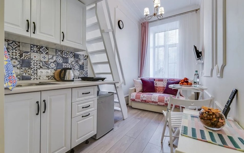 В апартаментах с окнами на тихий двор могут с комфортом разместиться до 3 гостей. Нижний уровень располагает мини-кухней, гостиной с небольшим раскладным диваном, санузлом с душевой. На верхнем ярусе обустроены 2 спальных места. Во всех номерах можно подключиться к Wi-Fi.