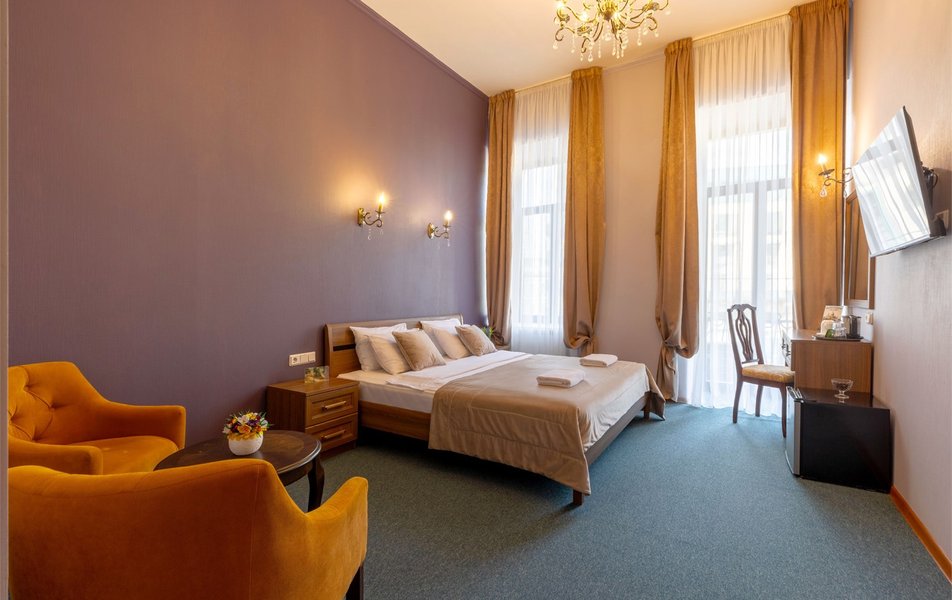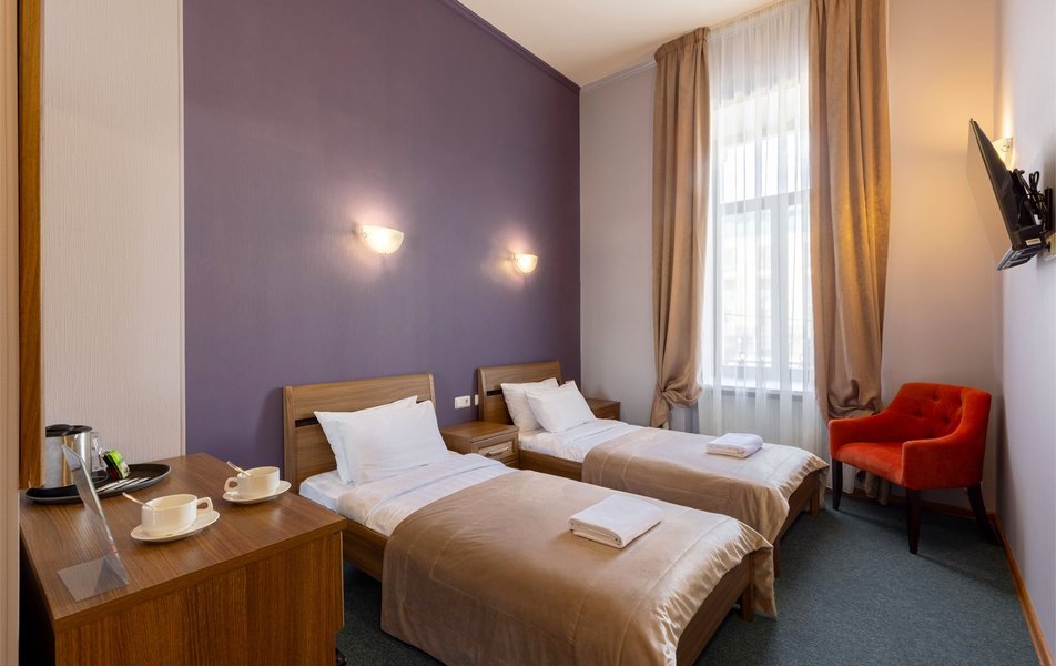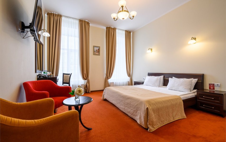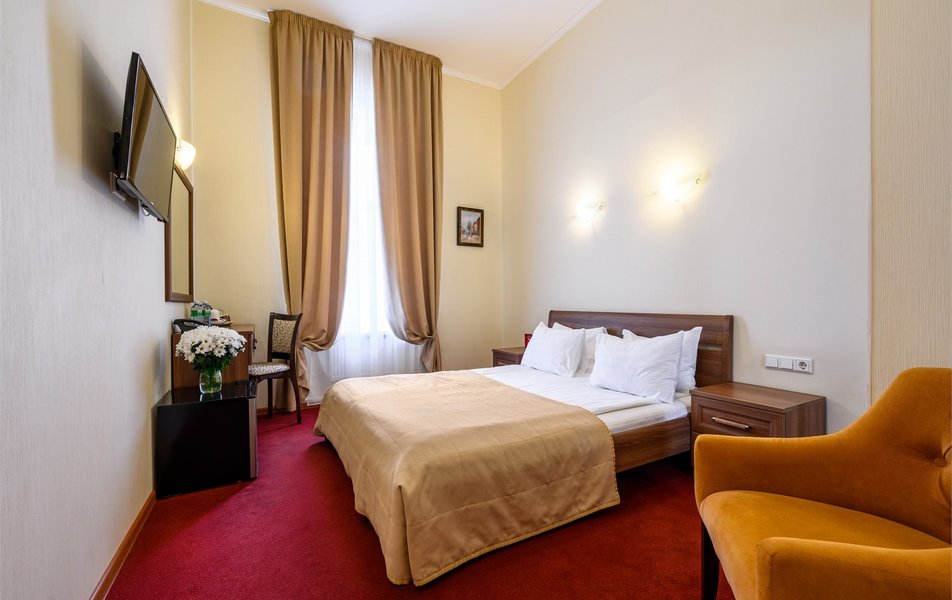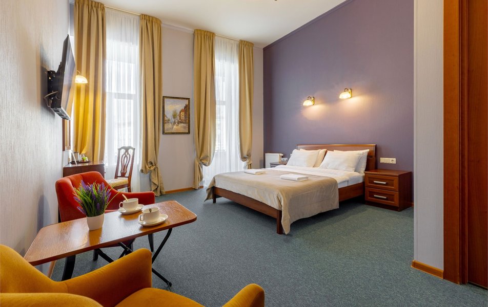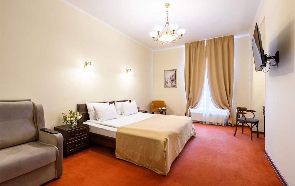 Комфортабельный просторный номер, вид открывается на набережную реки Мойки. В номере имеется гидромассажная ванная и кресло, которое разбирается и становится полноценным спальным местом.