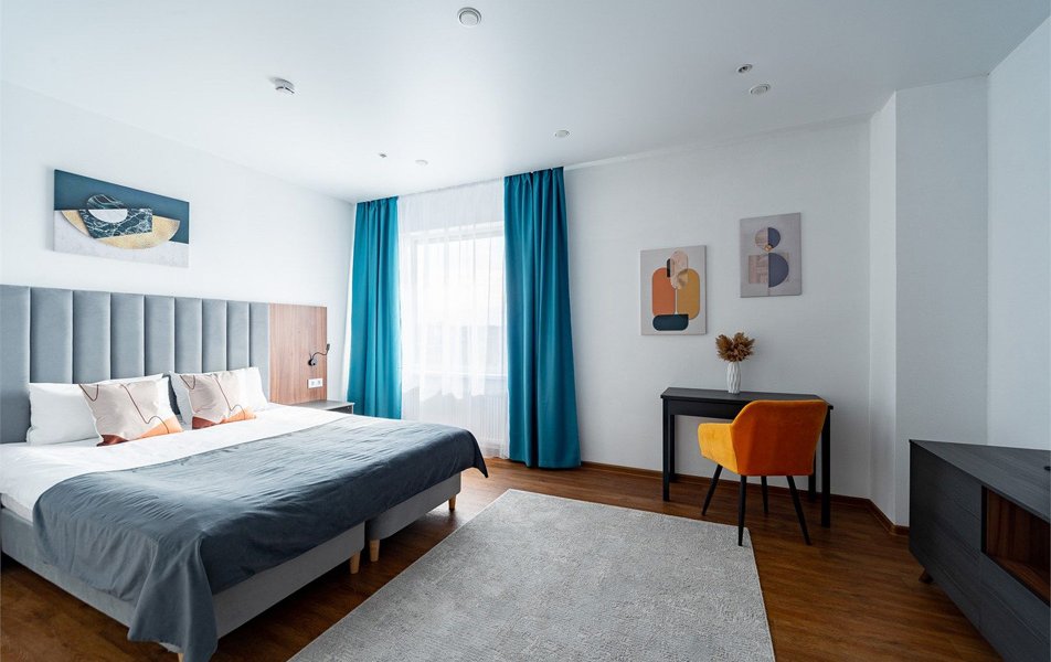 Гости могут остановиться в просторных четырехместных номерах или двухместных студиях со светлым, стильным ремонтом. Внутри предусмотрено все для комфортного отдыха –– удобные кровати, телевизоры, мебель, санузлы с ванной, оборудованные кухни с техникой, холодильниками, обеденными зонами и наборами посуды.