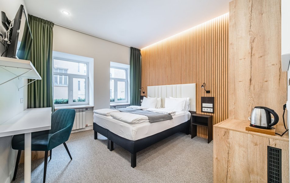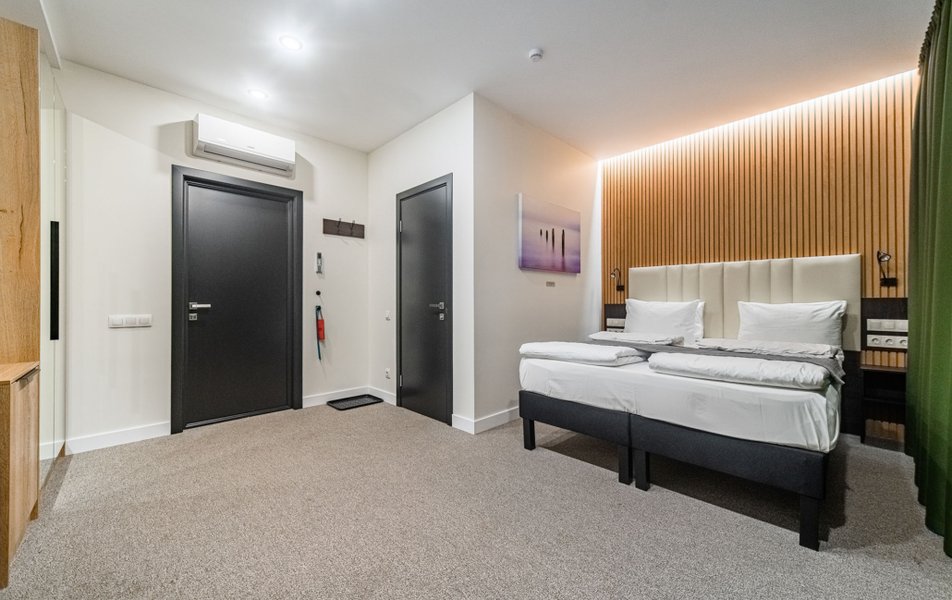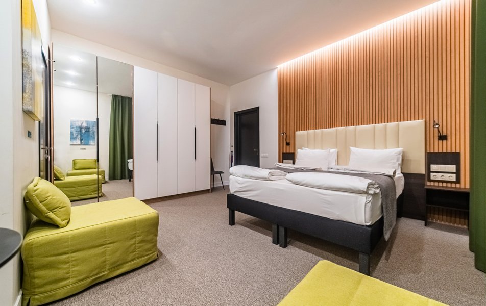 К услугам постояльцев — одноместные, двухместные и семейные студии, оформленные в спокойных тонах и продуманные до мелочей. В каждом номере: удобные ортопедические кровати, вместительные шкафы с зеркальными фасадами, мини-холодильник, чайная станция и современный LED-телевизор. Ванные комнаты оборудованы душем, феном, мягкими халатами, тапочками и набором средств гигиены.