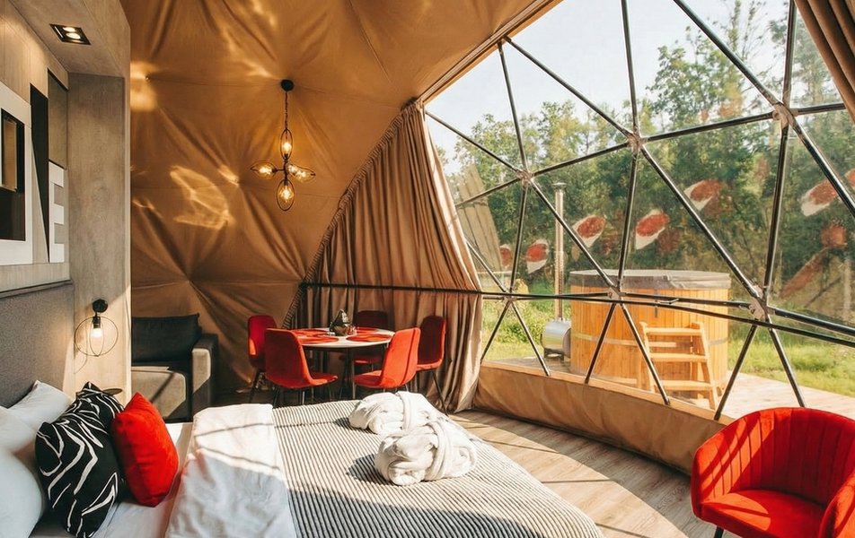 Для гостей предлагаются различные варианты размещения: смарт-типи, геокупола, дома на деревьях. Все они оснащены удобными спальными местами, шкафами для хранения вещей и собственными ванными комнатами с необходимыми туалетно-косметическими принадлежностями. Террасы объектов оборудованы купелями Фурако и костровыми чашами. На территории комплекса работают ресторан, кафе и пиццерия, предлагающие постояльцам разнообразие блюд и напитков.