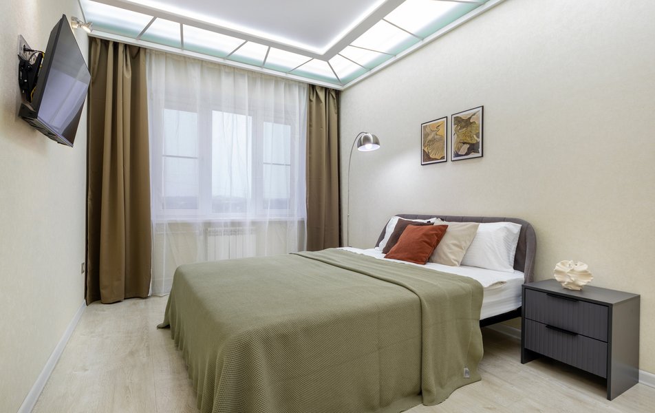 Внутреннее пространство площадью 34 квадратных метра продумано для комфорта до четырех гостей. Для сна предусмотрены двуспальная кровать и раскладной диван. В распоряжении гостей — кондиционер, два телевизора со Smart TV и Билайн TV, быстрый двудиапазонный Wi-Fi. Кухня полностью укомплектована не только техникой: газовой плитой, духовкой, холодильником, микроволновой печью и электрическим чайником, но и всей необходимой посудой, приборами и принадлежностями, что делает комфортным даже длительное пребывание. В ванной комнате установлен теплый пол, есть стиральная машина, фен и утюг. Для удобства гостей предусмотрены чистое постельное белье, комплект полотенец, а также средства гигиены: гель для душа, шампунь, мыло, зубные наборы, ватные палочки и диски.