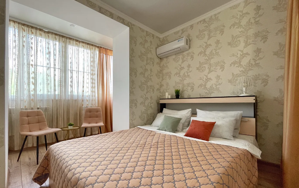 Пространство представляет собой просторную двухкомнатную планировку с изолированной спальней, рассчитанную на пять гостей. Спальные места организованы максимально удобно: двуспальная кровать, раскладной диван и кресло-кровать. В оснащение входит вся необходимая техника: два телевизора со спутниковым телевидением, кондиционер, микроволновая печь, электрический чайник, холодильник, стиральная машина, утюг с гладильной доской и фен. Кухонная зона укомплектована столовой и чайной посудой для приготовления и приема пищи. Ванная комната оснащена всем необходимым, гостям предоставляются чистое постельное белье и полотенца. К дополнительным преимуществам относятся индивидуальное отопление и наличие сейфовой двери, обеспечивающей спокойствие.