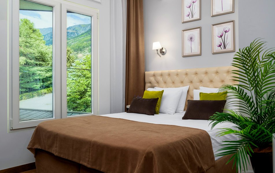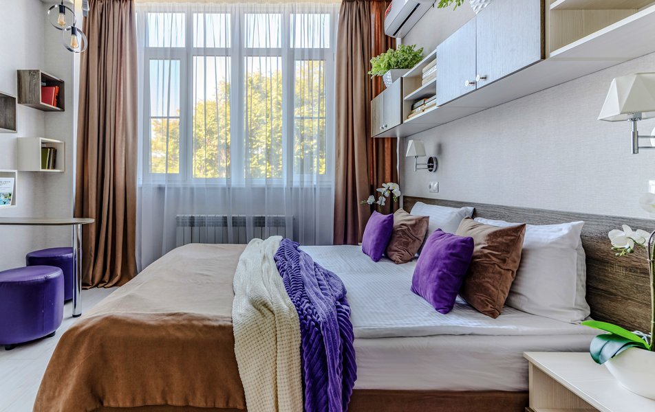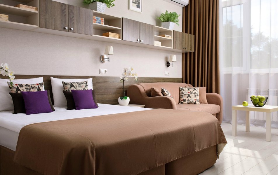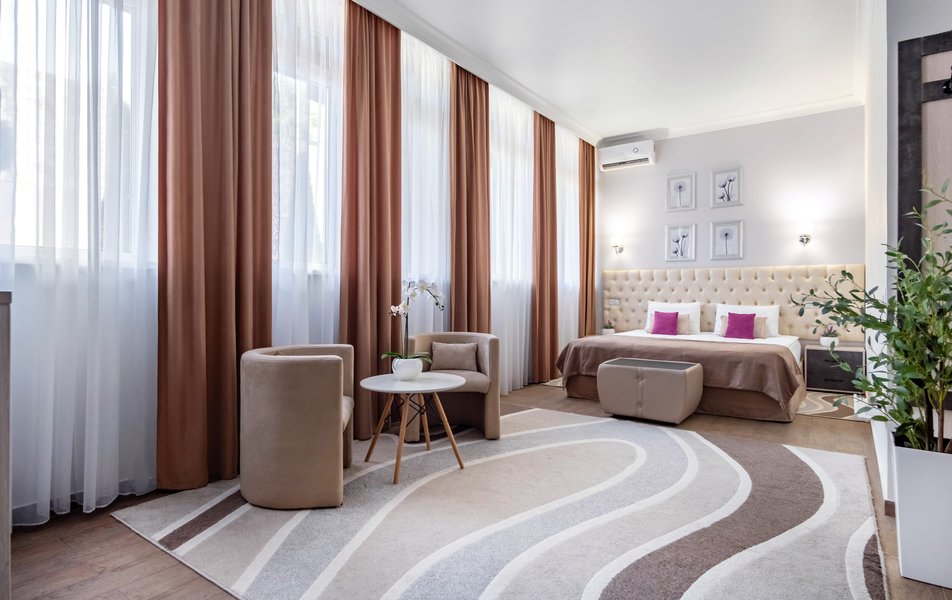 Гостей ожидают номера повышенной категории комфорта — Студио, Люкс и Апартаменты с кухней, расположенные в корпусе. И отдельный таунхаус, расположенный по адресу - ул. Маркова, 98. В номерах современный стильный интерьер, оформленный в пастельной цветовой гамме с использованием темных контрастных оттенков. В каждом номере есть санузел с туалетными принадлежностями, телевизор-ЖК, фен.