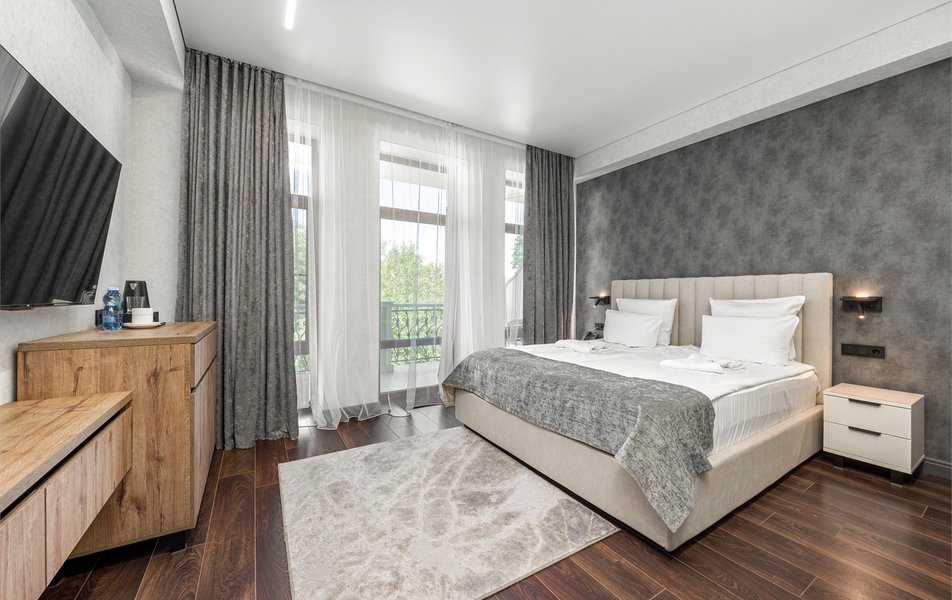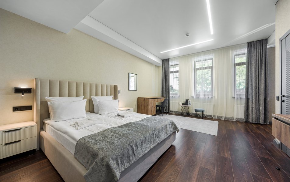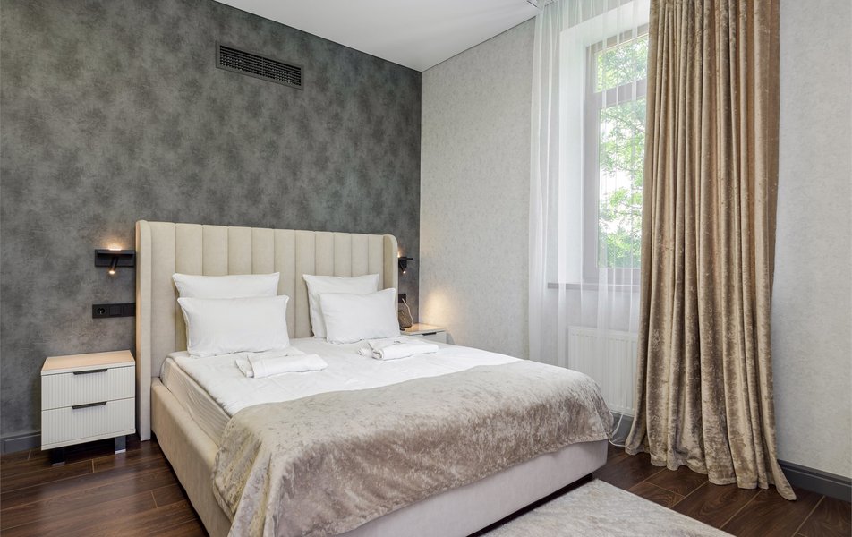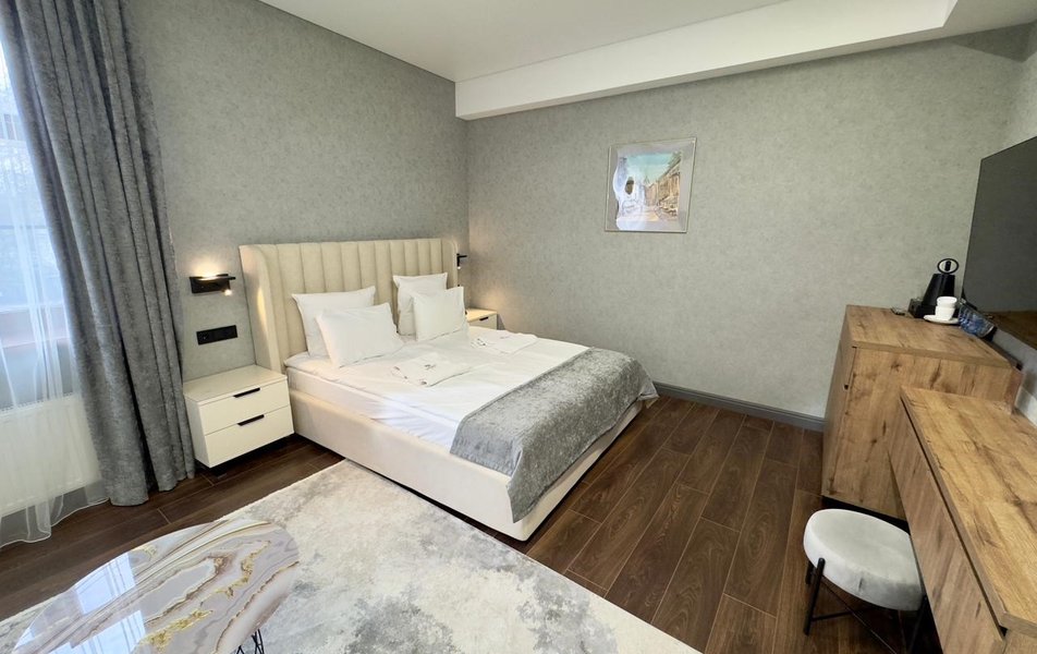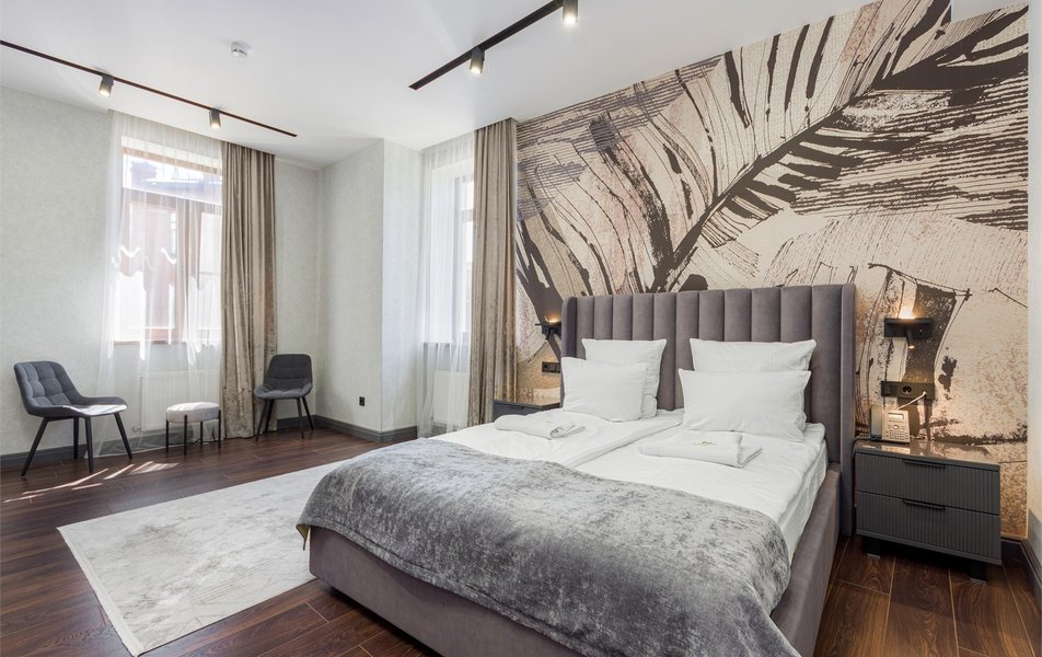 Четырехэтажное здание отеля с лифтом разместилось на одной из главных улиц города – проспекте Ленина. Жилой фонд состоит из 22 номеров разных категорий. В комнатах лаконичный интерьер, выдержанный в преимущественно серых оттенках. Каждый номер оснащен санузлом с душем, есть кондиционер, телевизор и сеть wi-fi.