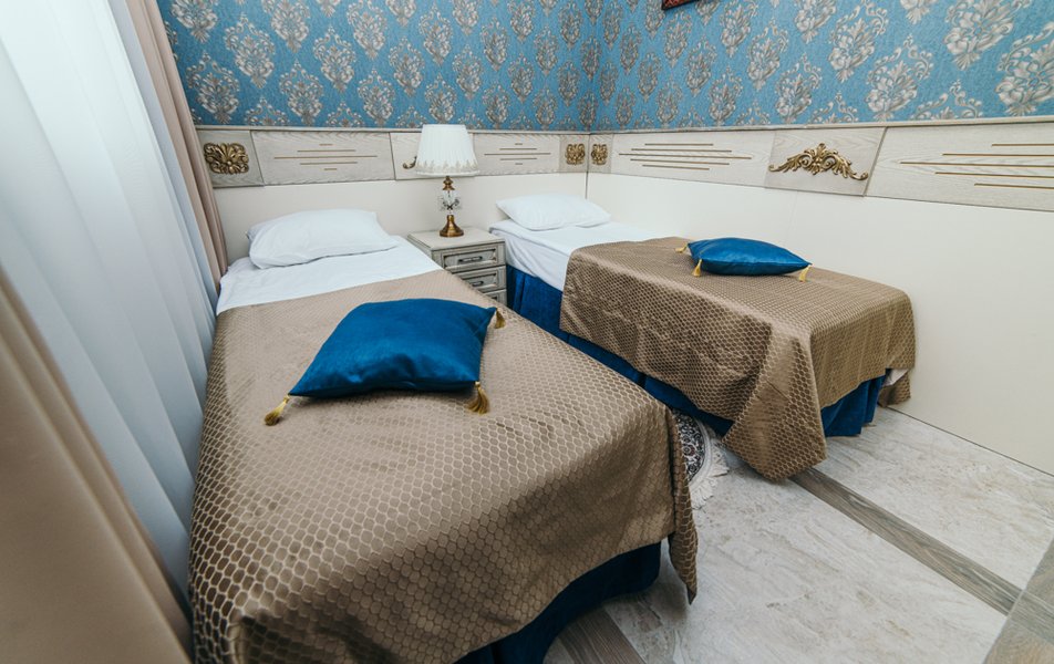 Двухэтажный корпус отеля, выстроенный в мавританском стиле, разместился на пересечении курортного проспекта с улицей Вокзальной. Гостей ожидают номера первой категории, Стандарт и Джуниор. В номерах классический интерьер, в котором используются роскошные синие, пастельные и золотые оттенки. В каждом есть собственный санузел с ванной или душем, набор косметических принадлежностей для гостей, качественная удобная мебель и необходимая бытовая техника — телевизор, фен, электрочайник, в некоторые комнатах установлен кондиционер.