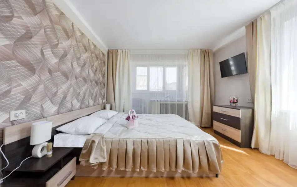 Светлые однокомнатные апартаменты рассчитаны на комфортное размещение четырёх человек. В спальной зоне установлена двуспальная кровать, в гостиной — удобный диван, образующий дополнительное спальное место. В комнате есть телевизор, а на всей территории доступен беспроводной Wi-Fi. Кухня полностью оборудована для самостоятельного приготовления пищи: газовая плита с духовым шкафом, холодильник, микроволновая печь, электрочайник и полный набор посуды. Для бытовых нужд предусмотрены стиральная машина, утюг с гладильной доской.