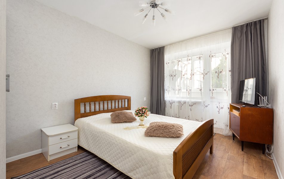 Светлые однокомнатные апартаменты с балконом рассчитаны на комфортное размещение двух человек. В спальной зоне установлена двуспальная кровать с прикроватными тумбочками, в гостиной — удобный диван. В распоряжении гостей телевизор и беспроводной Wi-Fi. Кухня полностью оборудована для самостоятельного приготовления пищи: газовая плита с духовым шкафом, холодильник, микроволновая печь, электрочайник и полный набор новой посуды. Для бытовых нужд предусмотрены стиральная машина, утюг с гладильной доской и фен.