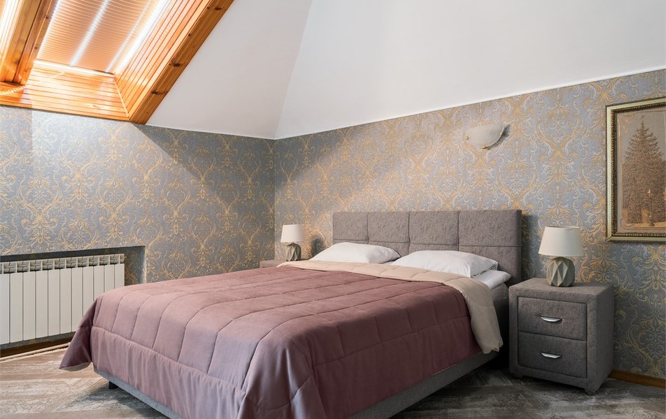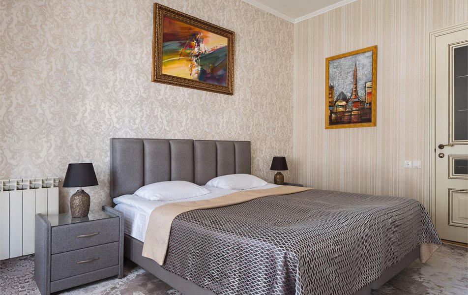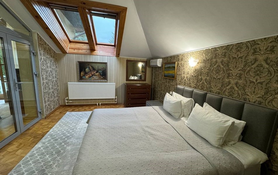 Номерной фонд разного уровня комфорта и вместимости расположился в красивом 3-этажном здании, архитектура которого напоминает старинный замок. Комнаты оформлены в классическом стиле. В них есть вся необходимая мебель для отдыхающих, телевизор с плоским экраном, кондиционер, Wi-Fi. Для самостоятельного приготовления еды кухня оборудована бытовой техникой и посудой. На открытой террасе есть зона-барбекю.