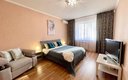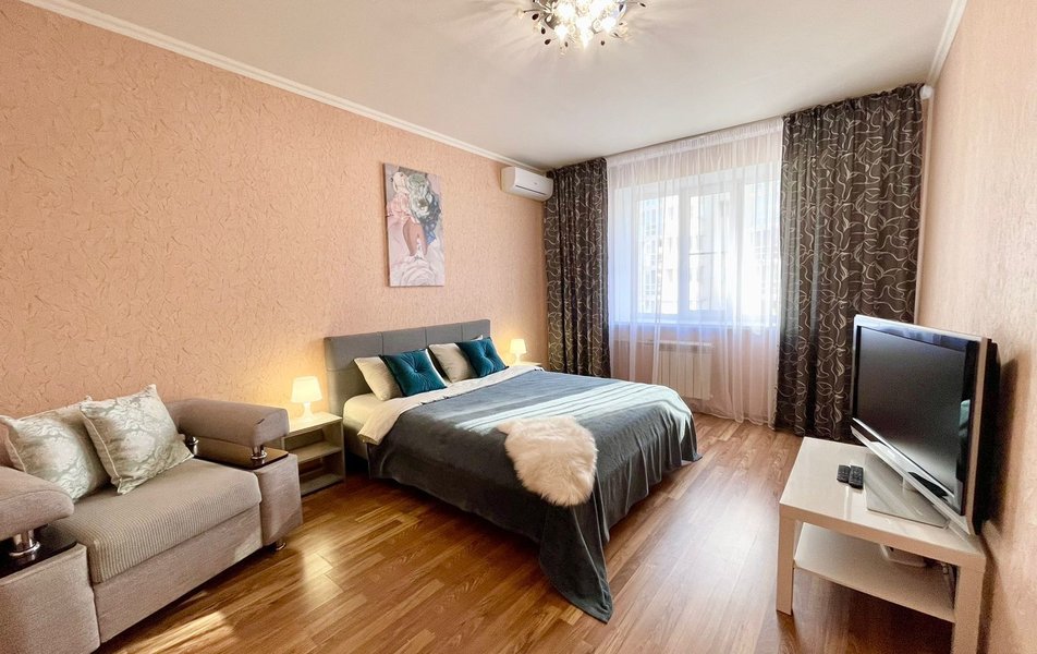Просторные апартаменты площадью 60 квадратных метров рассчитаны на комфортное размещение четырёх гостей. Здесь предусмотрены два полноценных спальных места: двуспальная кровать и удобный раскладной диван. Просторная комната объединяет зону отдыха и кухонный уголок, создавая атмосферу домашнего уюта. В распоряжении гостей — современная техника: телевизор, кондиционер, холодильник, газовая плита, микроволновая печь и электрочайник. На кухне имеется полный набор посуды и столовых принадлежностей, а также обеденный стол со стульями. Для бытовых нужд предусмотрены стиральная машина, утюг и гладильная доска.