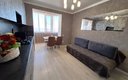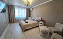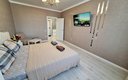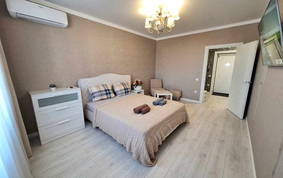 Просторные апартаменты площадью 60 квадратных метров рассчитаны на комфортное размещение четырёх человек. Основное спальное место — двуспальная кровать, а дополнительным служит удобный диван. В комнате есть телевизор, кондиционер для поддержания комфортной температуры, а также вместительный шкаф, комод и вешалка для хранения вещей. Продуманные детали интерьера, включая прикроватные тумбочки и зеркало, создают атмосферу домашнего уюта.