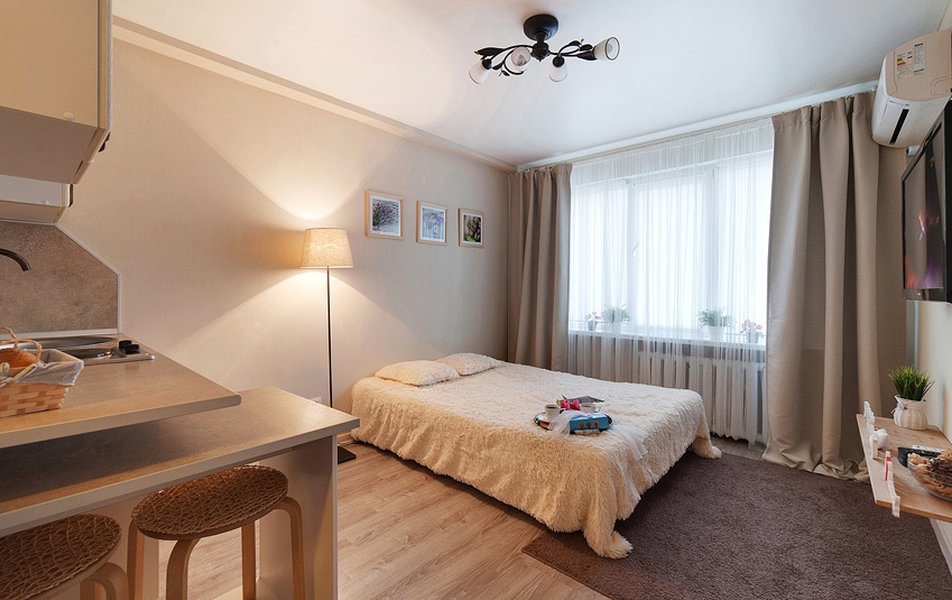 Внутреннее пространство оформлено в стиле современного евроремонта с вниманием к каждой детали. Спальное место представлено удобным раскладным диваном-кроватью. Кухня полностью оборудована для приготовления пищи: есть варочная поверхность, микроволновая печь, а также вся необходимая посуда и столовые приборы. В совмещенном санузле установлена душевая кабина и стиральная машина. К приезду гостей подготовлены чистое постельное белье, полотенца, фен и средства гигиены. В числе приятных мелочей — чай и кофе для спокойного утра. В распоряжении гостей также телевизор с диагональю 40 дюймов, кабельное телевидение и стабильный беспроводной интернет.