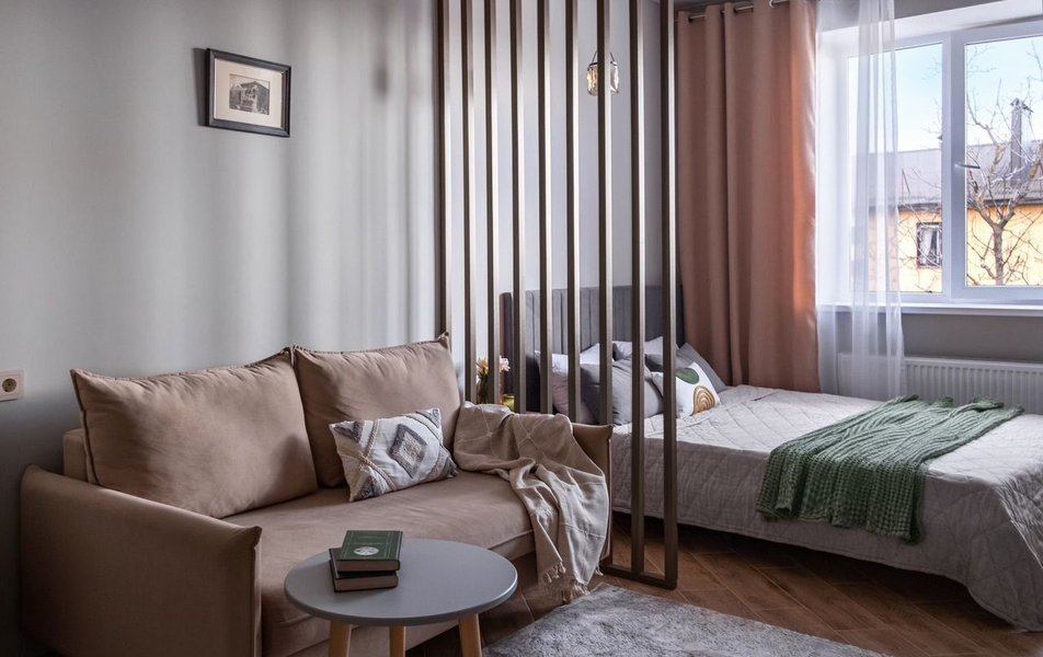 Студия оформлена с ярким дизайном и акцентными деталями, создающими атмосферу стиля и уюта. Спальное место представлено кроватью шириной 160 см с ортопедическим матрасом, удобными подушками и белоснежным сатиновым бельем отельного стандарта. Кухня оснащена всем необходимым: индукционная плита, холодильник, микроволновая печь, тостер, чайник и капельная кофеварка. В ванной комнате гостей ждут фен, стиральная машина, халаты, одноразовые тапочки, а также полный набор гигиенических принадлежностей, включая шампунь, гель для душа, кондиционер, косметические и зубные наборы. В числе приятных мелочей — минеральная вода, чай и кофе для спокойного утра. В распоряжении гостей телевизор с функцией Smart TV, утюг с гладильной доской и высокоскоростной беспроводной интернет, идеально подходящий для удаленной работы.