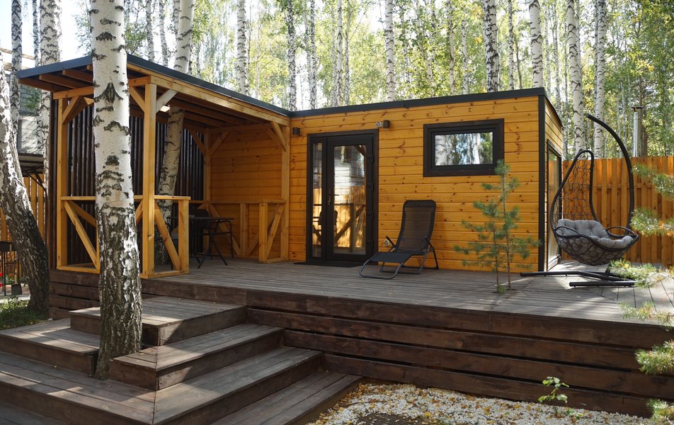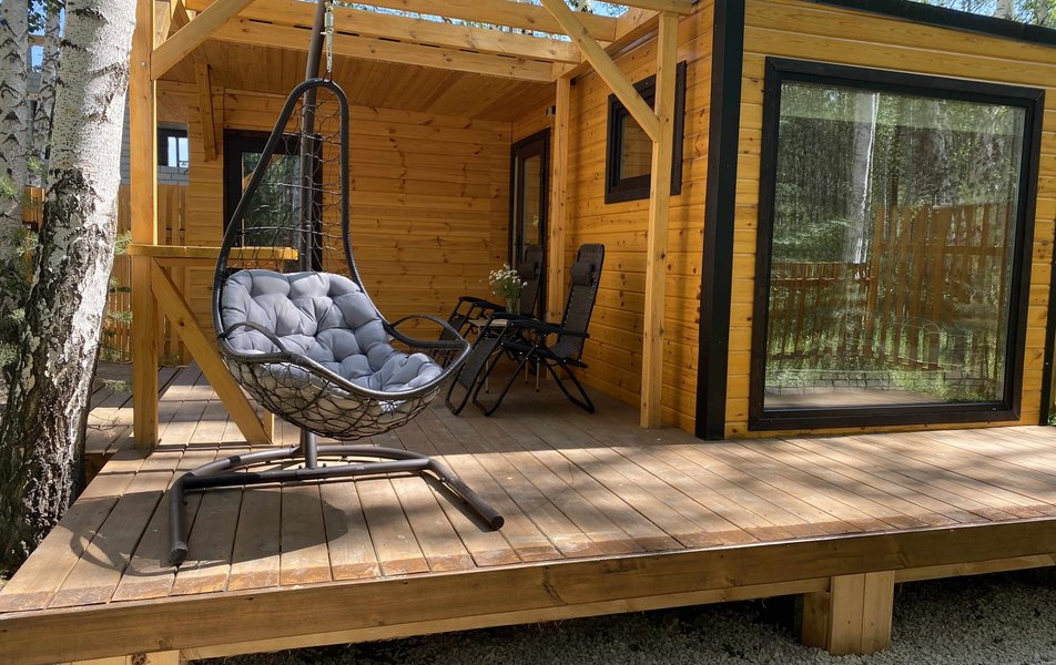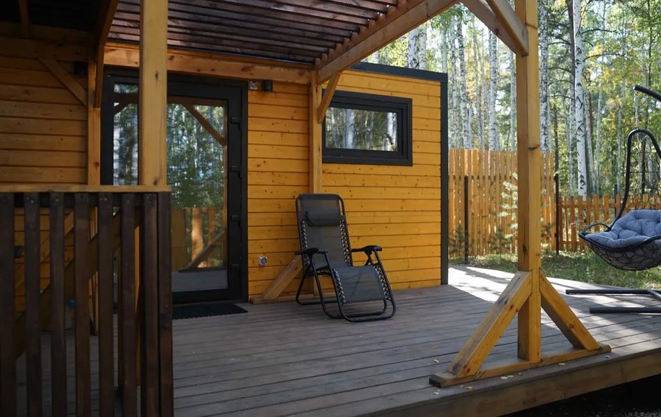 На территории гостевого дома расположено четыре дома с панорамным остеклением и террасой, что позволяет ощутить единение с природой, не отказываясь от привычных удобств. Каждый дом имеет собственную огороженную территорию с парковкой, мангальной зоной и выходом в лес. Внутри есть все необходимое: кухня с индукционной плитой, микроволновкой, холодильником и посудой, ортопедический матрас на кровати, телевизор, душ с горячей водой и фен. Доступен беспроводной интернет Wi-Fi.