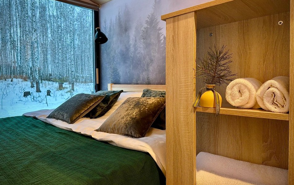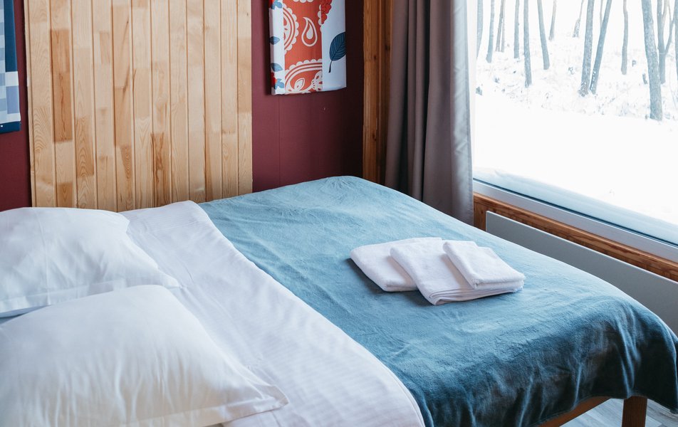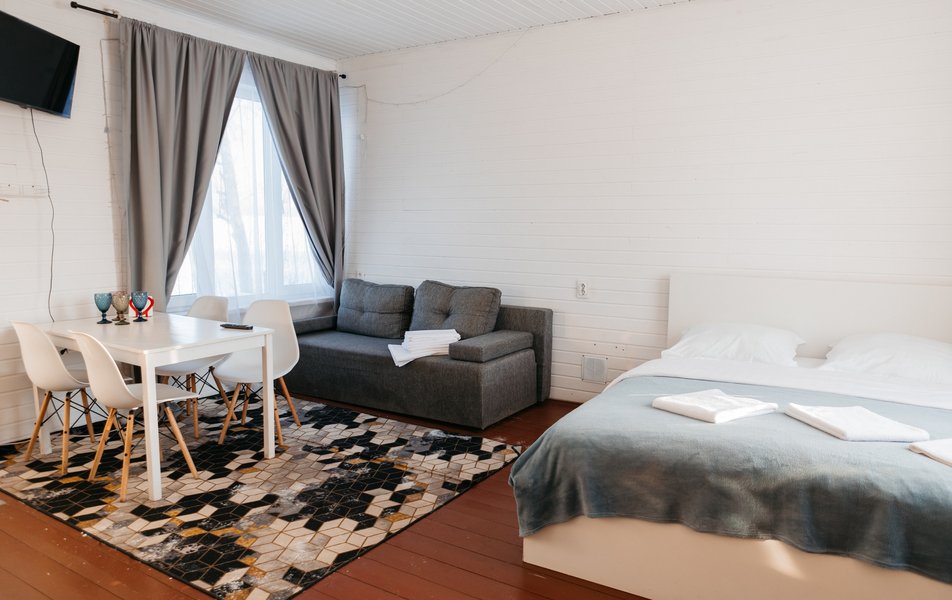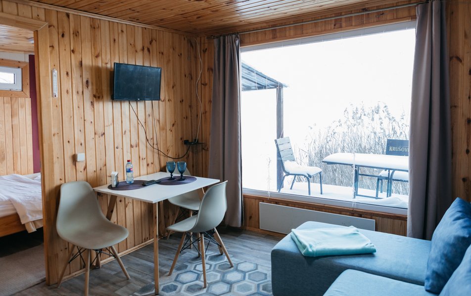 Комплекс занимает территорию площадью 11 гектаров, на которой разместились гостиничный корпус и уютные деревянные домики с меблированной террасой. Номера укомплектованы всем необходимым: в комнатах – удобные кровати, есть электрочайник, микроволновая печь, холодильник, предусмотрен персональный санузел. В ряде домиков организована мини-кухня. Из окон открываются красивые виды на озеро или лес.