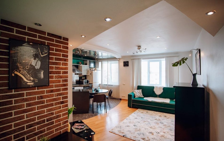 Апартаменты располагаются в 9-этажном здании с лифтом. Интерьер комнат выполнен в зеленых оттенках, в них установлена необходимая мебель для отдыха, есть места для хранения одежды, телевизор, Wi-Fi, стиральная машина, вентилятор. Санузел оборудован ванной. На кухне предусмотрена большая обеденная зона, есть плита, микроволновая печь, электрический чайник, холодильник, а также набор необходимой посуды и столовых приборов. Личный транспорт можно оставить на парковке возле дома.
