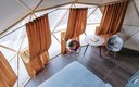 К размещению гостей предлагаются гостевые дома в разном архитектурном исполнении, высотой в 1 и 2 этажа, дом-купол, а также номера различной вместимости и уровня комфорта. В летний период доступно проживание в глемпинге. В любом из вариантов размещения отдыхающих ждет комфортная мебель для отдыха, места для хранения одежды, а также современный санузел, который может быть индивидуальным или общим для номеров, на этаже. В гостевых домах предоставляется необходимая техника, включая мини-холодильник, кондиционер, телевизор. Оборудованы собственные кухонные зоны с набором посуды, столовыми и бытовыми приборами.