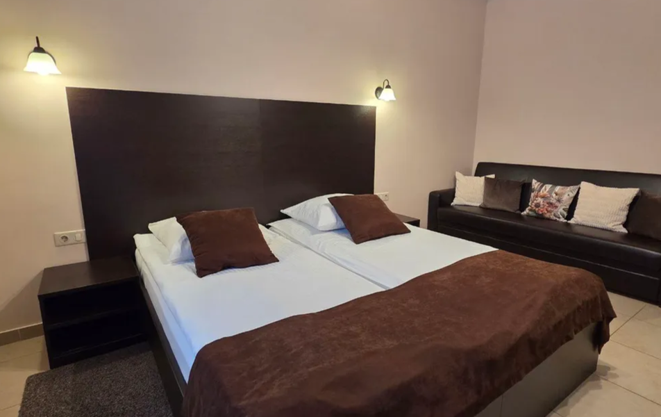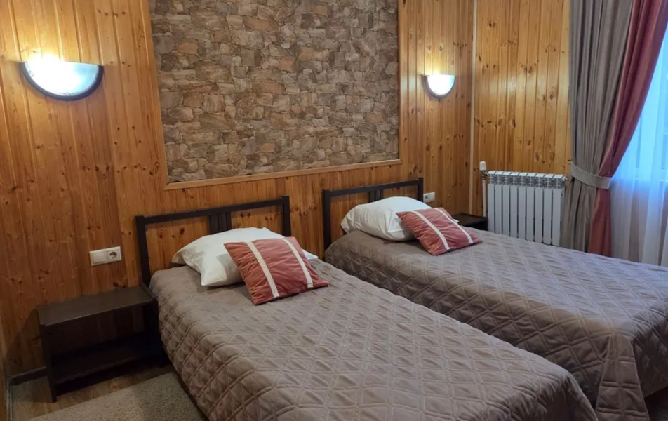 Трехэтажное здание разместилось на тихой зеленой улице среди частного сектора. Жилой фонд предлагает отдыхающим двухместные номера Double и Twin. В каждом номере есть санузел с душевой кабиной, кондиционер, телевизор-ЖК, набор посуды для чая.